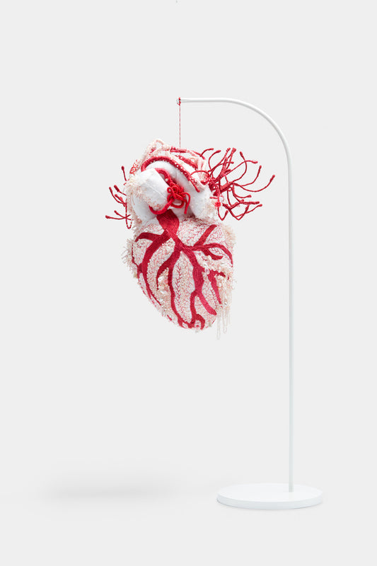 Absent women are represented in Shin's practice through soft sculpture facsimiles of human organs made from soft cloth or woven as tapestry and embellished with beading, embroidery and needlework. These intricate sculptures draw on the tactile tradition of women’s craft to reclaim agency within a cultural narrative that is historically gendered. Her works act as vessels, not only as an expression of personal and collective histories, but as a means of symbolic reclamation against a backdrop of marginalisation. Each thread, bead, and stitch stands as both a silent protest and a powerful tribute to absent and unseen women.